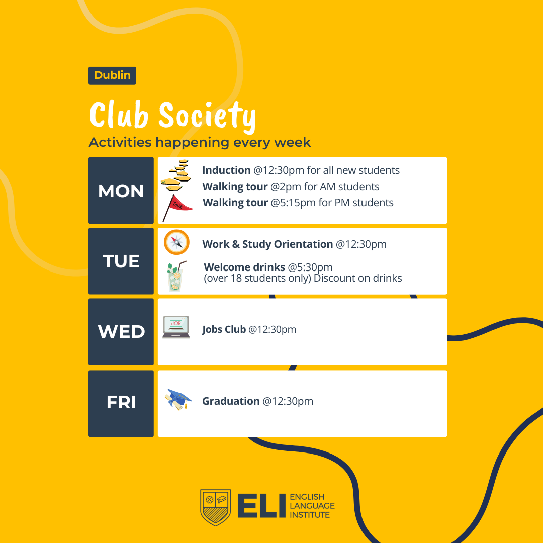 - Jobs Club: Se celebra todos los miércoles en nuestras escuelas, y a través de estos, brindamos a los estudiantes información crucial sobre cómo encontrar empleo en Irlanda, cómo preparar su CV en formato europeo, cómo prepararse para entrevistas de trabajo y qué páginas o portales de empleo son los más populares y confiables para ofrecerse como candidato a miles de vacantes disponibles en el país. Periódicamente también se ofrecen ferias de empleo dentro de las escuelas, que son espacios para que compañías se acerquen a la comunidad estudiantil para ofrecer vacantes de empleo.