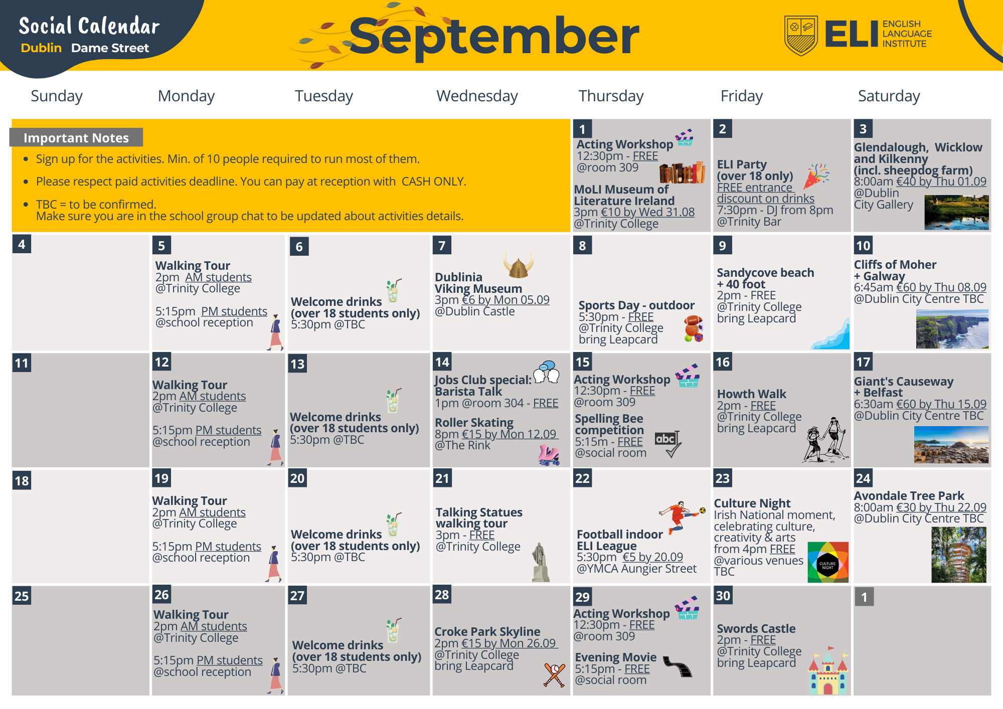 De forma mensual, el equipo de Actividades de ELI Schools propone actividades de corte gratuito y pagas, para promover la integración de sus estudiantes a través de dinámicas turísticas, culturales o de ocio. Los estudiantes pueden apuntarse a las que deseen en la recepción de las escuelas y de esta forma, asegurar su participación.