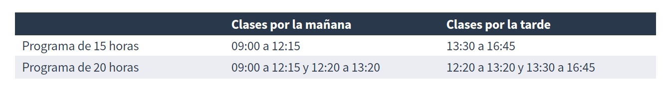 Los estudiantes pueden elegir entre 15 o 20 horas semanales, con clases por la mañana o la tarde.